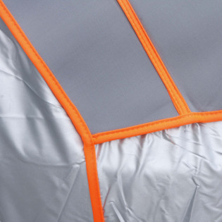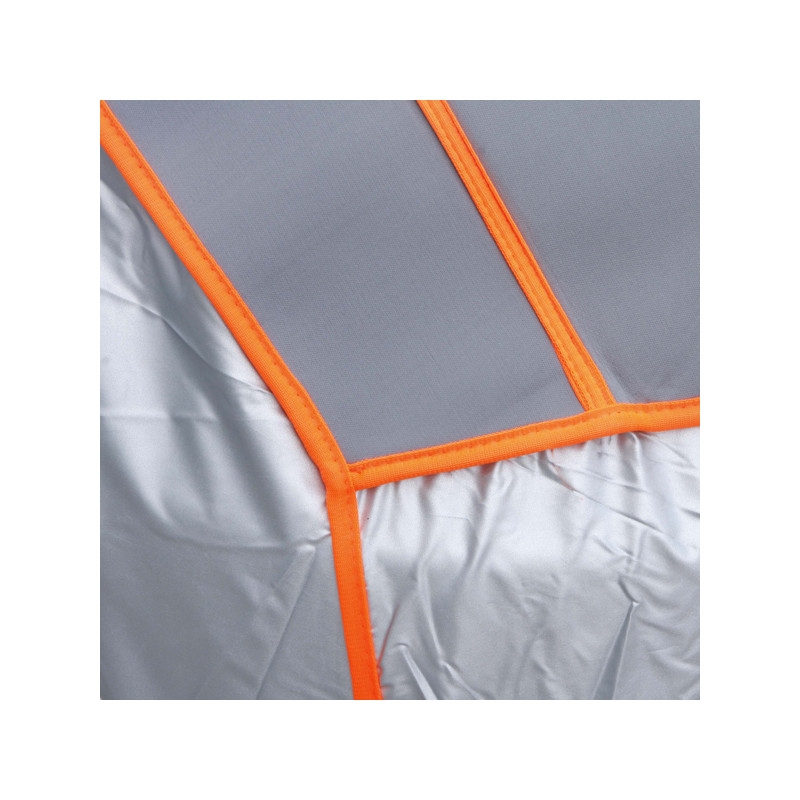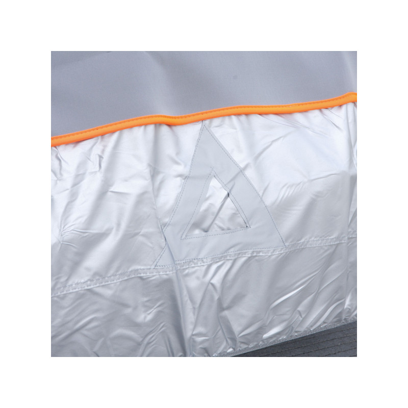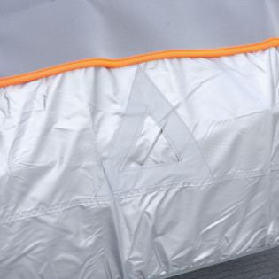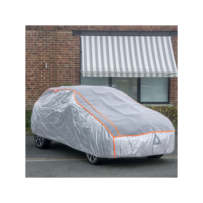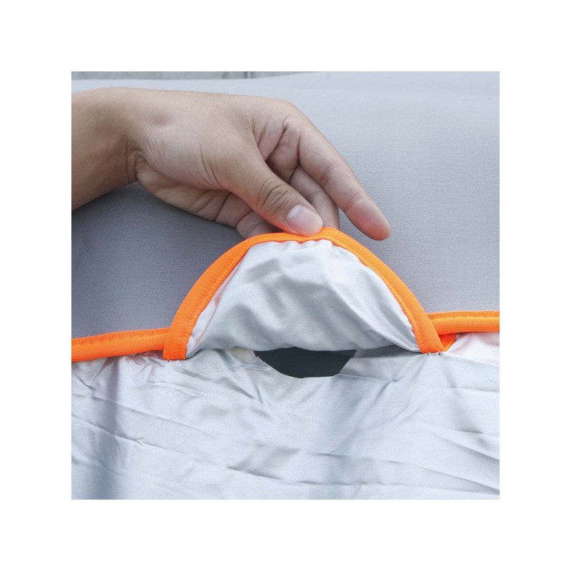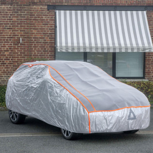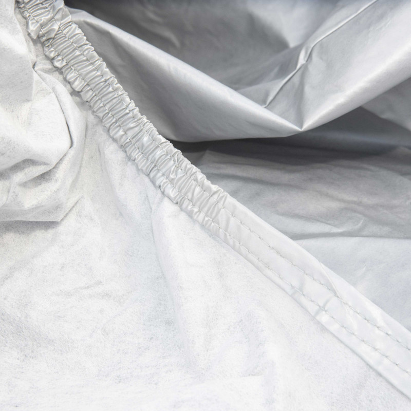 3- Förstärkt skydd och enkel installation : För optimal skötsel är skyddet helt fodrat med ett mjukt tyg som skyddar karosseriet från repor. Ett hellångt elastiskt band ger extra stöd och gör det lätt att montera. Varning: Använd inte skyddet i kyliga förhållanden, eftersom det kan fastna på karossen.
