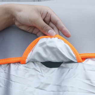 4- Tekniska egenskaper och praktiska fördelar : Sammansättning: 100% polyester, Förstärkt foder: 100% polyester + 4 mm absorberande skum, Ytterfärg: Metallgrå, Fäste: Robust fästrem för vindar upp till 70 km/h, Skötsel: Handtvättbar, Smart: Levereras i en praktisk bärväska för enkel förvaring och användning inom räckhåll.